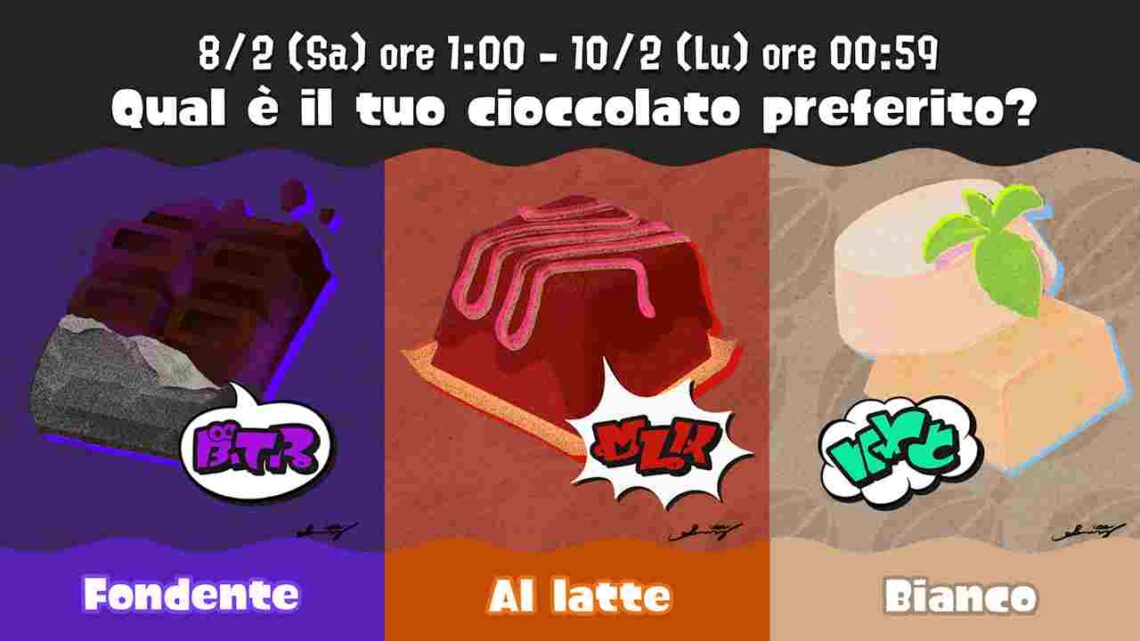 Splatoon 3: annunciato il ritorno dello Splatfest, Qual è il tuo cioccolato preferito: Fondente, al Latte, Bianco