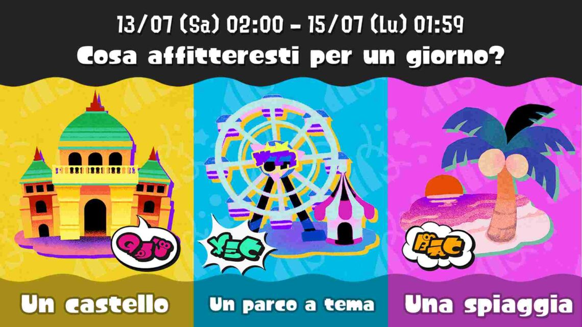 Splatoon 3: annunciato lo Splatfest, Cosa affitteresti per un giorno? Castello, parco a tema o spiaggia?
