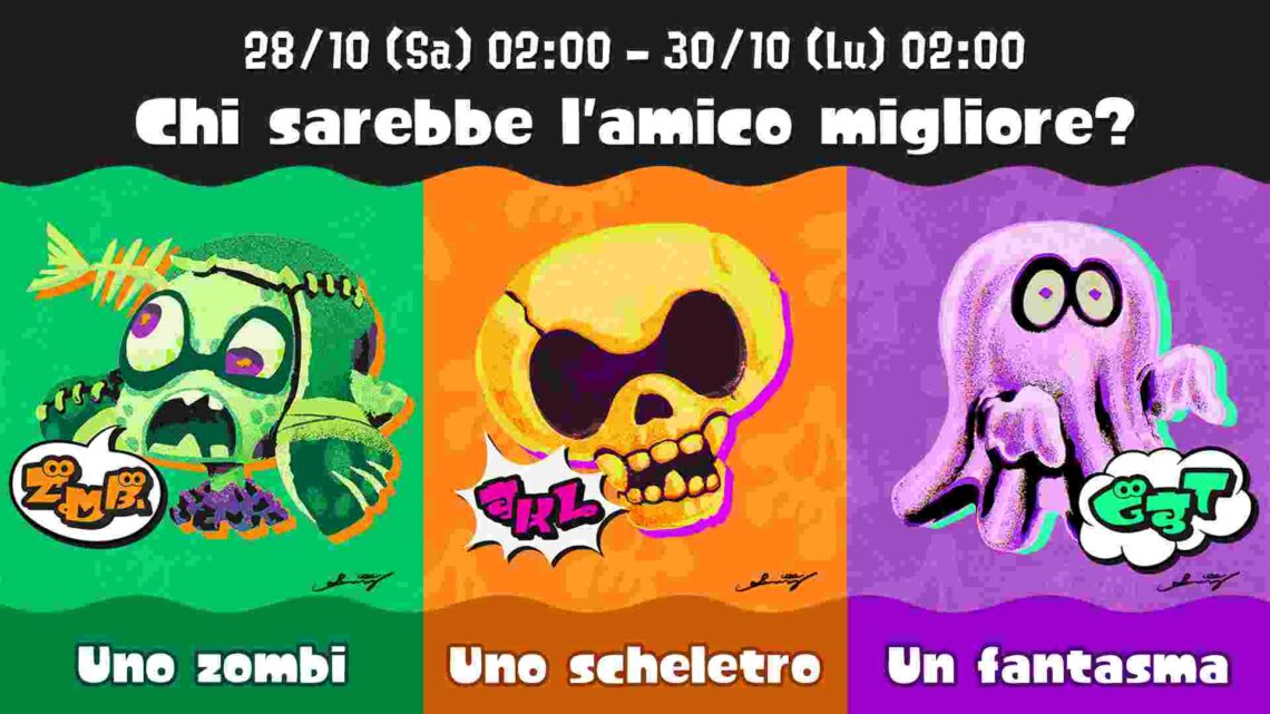 Splatoon 3: annunciato lo Splatfest di Halloween, Chi sarebbe l’amico migliore: Uno zombie, uno scheletro o un fantasma?