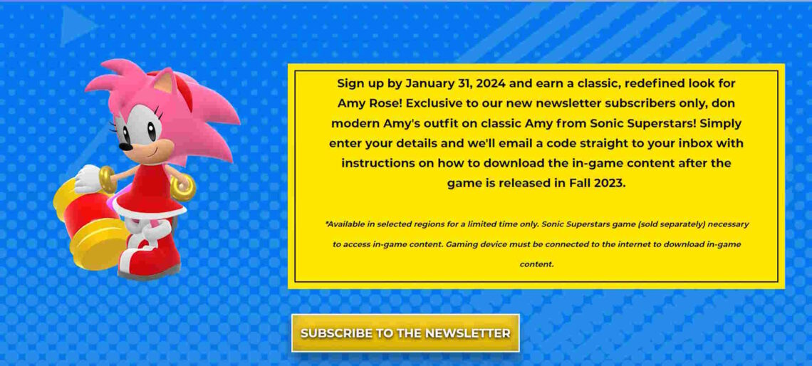 Da quanto rivelato dalla stessa SEGA infatti, coloro che si iscriveranno alla newsletter di Sonic Superstars entro il 31 gennaio 2024, potranno ottenere una skin moderna per Amy Rose (nella sua versione classica) all’interno del gioco, anche su Nintendo Switch.