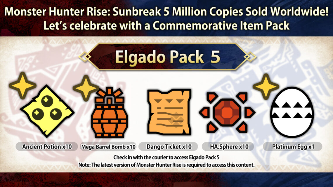 Capcom ha rilasciato l’Elgado Pack 5 in occasione del raggiungimento di questo obiettivo, contenente, Ancient Potion x10, Mega Barrel Bomb x10, Dango Ticket x10, HA.Sphere x10 e Platinum Egg x1.
