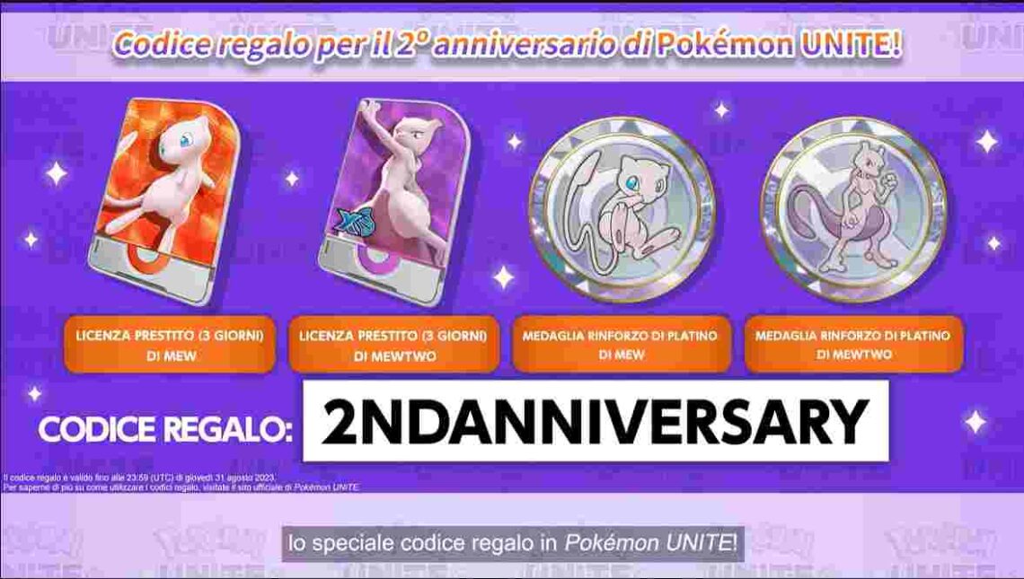 Inserendo il codice “2NDANNIVERSARY” all’interno dei menù di riscatto di Pokèmon UNITE (fino al 30 giugno), sarà infatti possibile ottenere una licenza di prova di Mew e Mewtwo, oltre alle medaglie rinforzo di platino degli stessi.