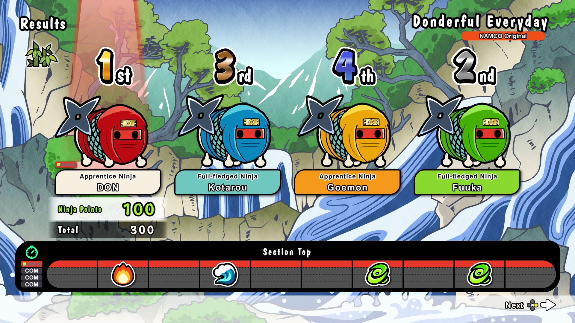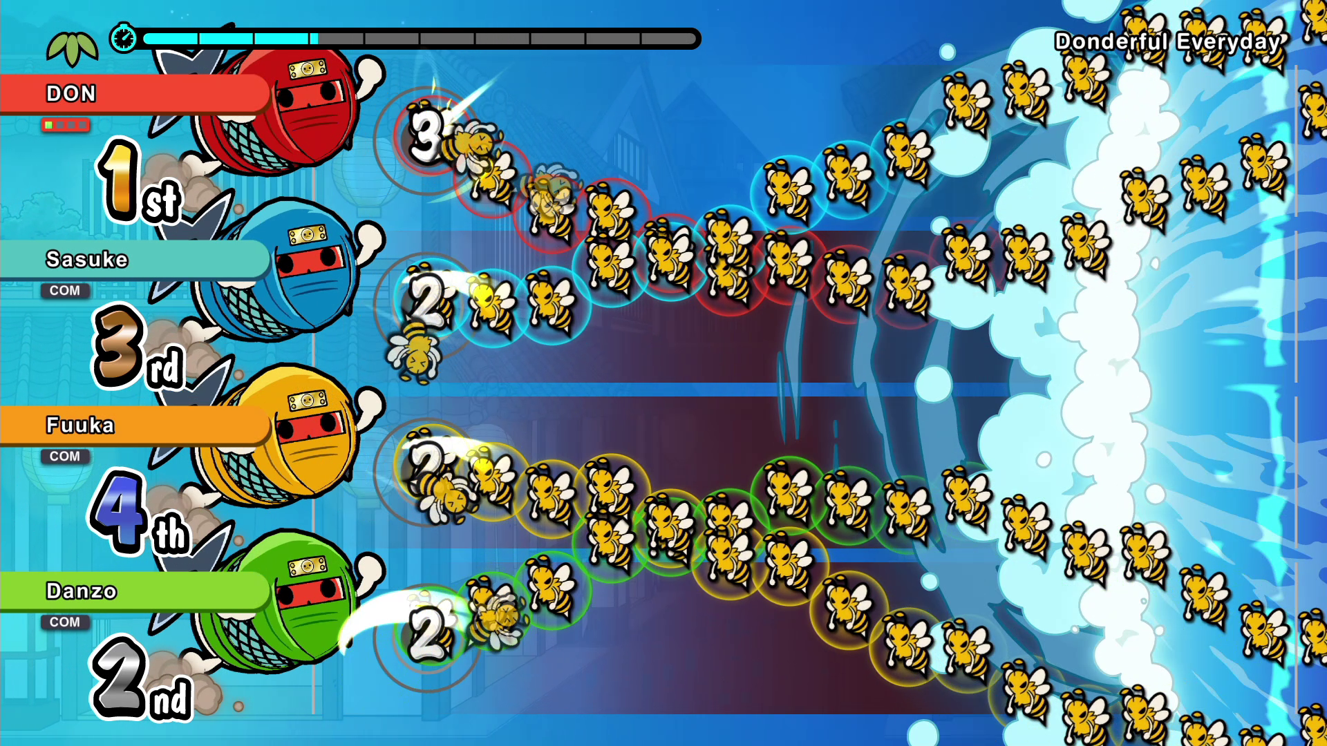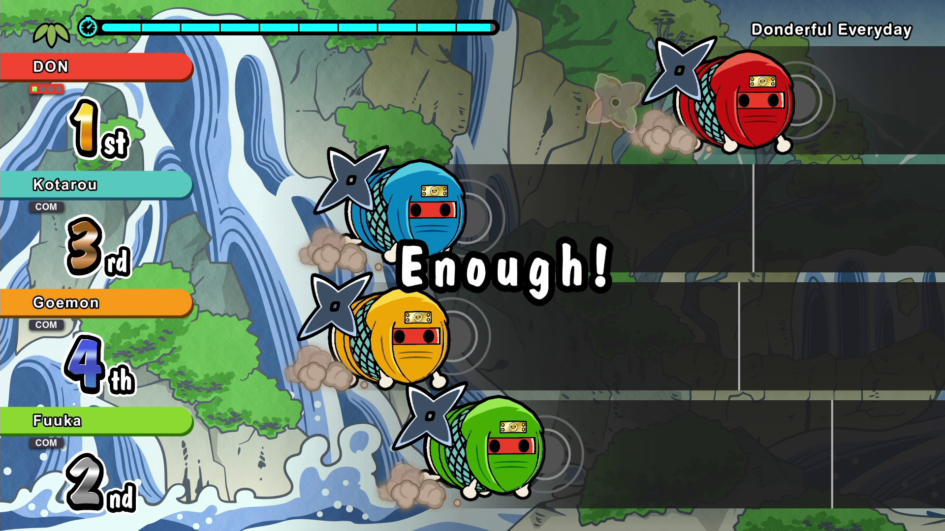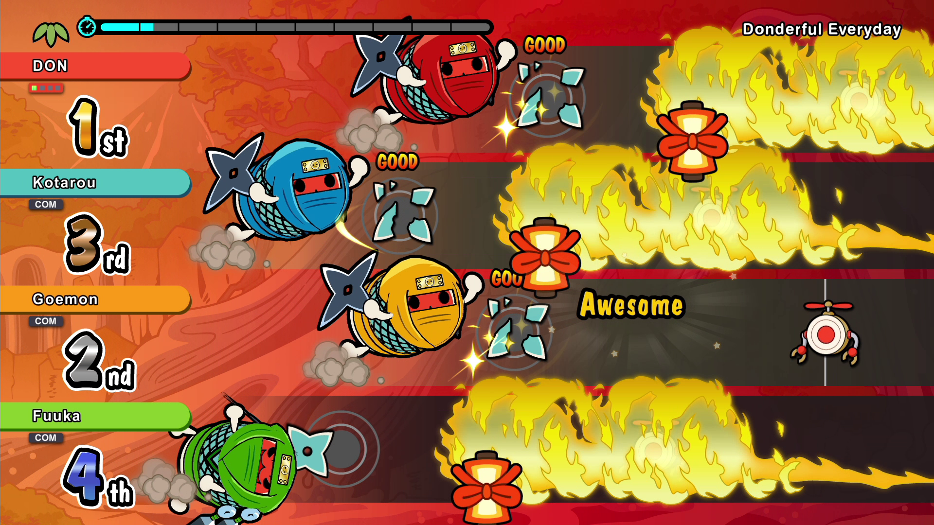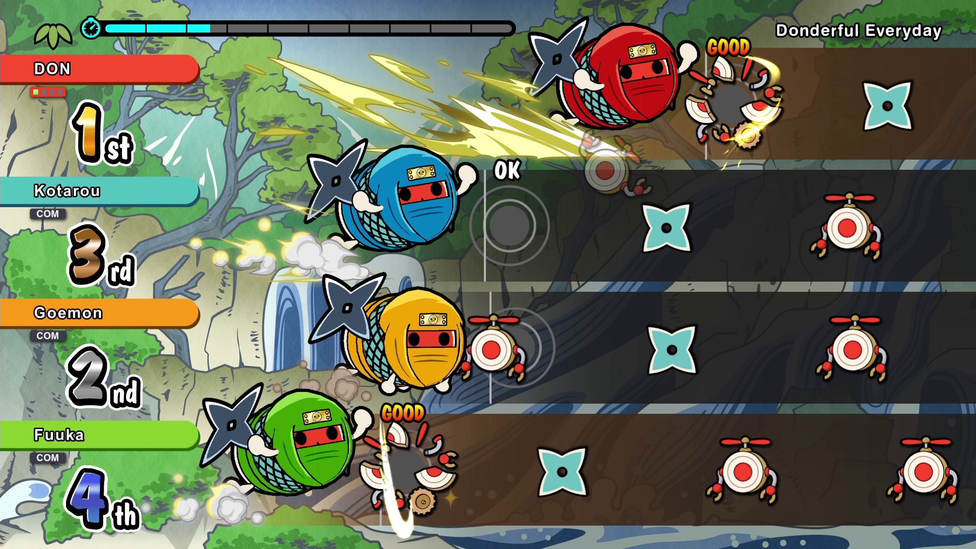 Introducing “Run! Ninja Dojo,” a fun party game that can be enjoyed by up to four players at once! Embark on a Ninja Training session, and defeat enemies by drumming skillfully and make DON-chan progress forward!