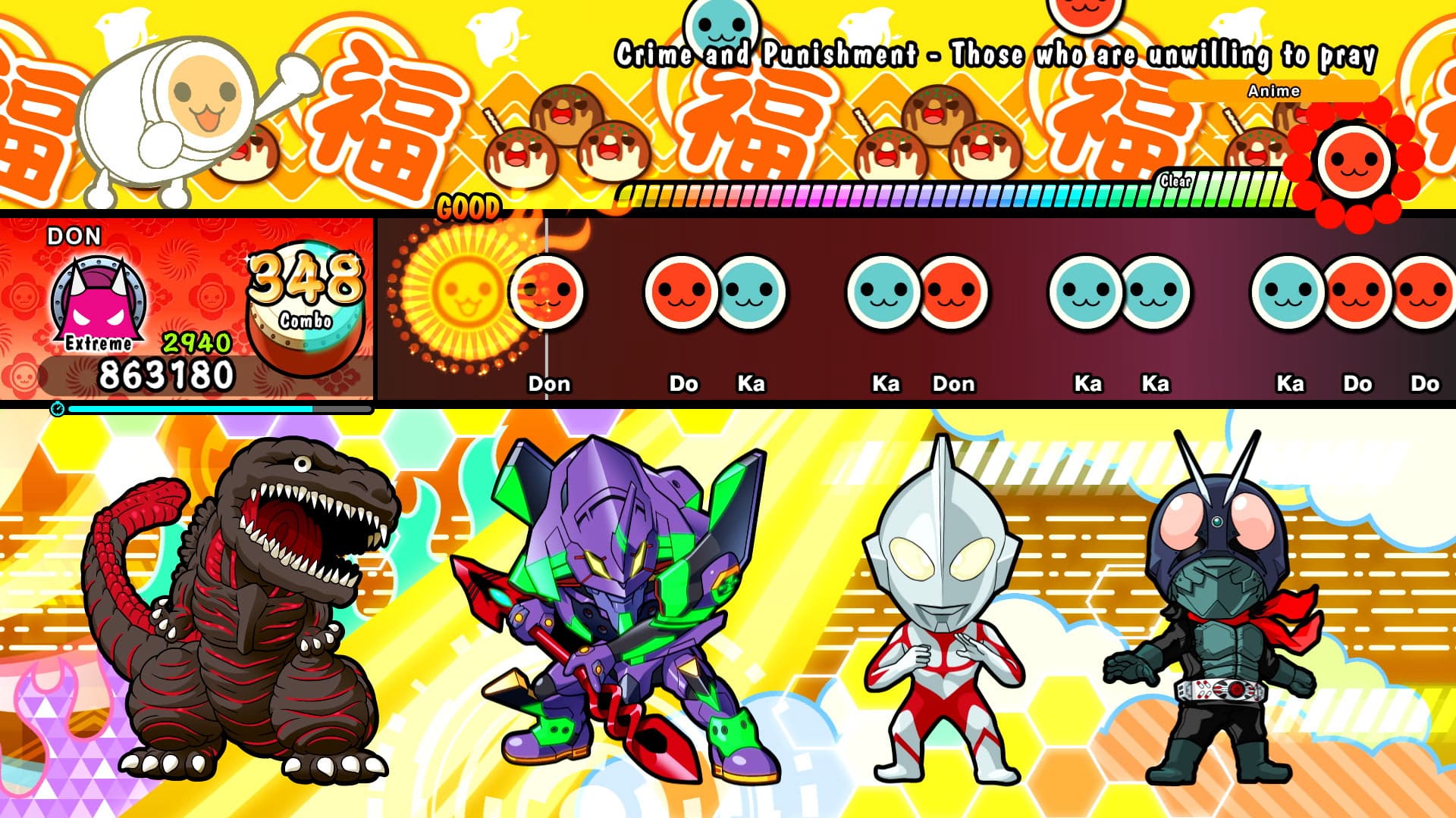 The DLC also features new mini characters – Godzilla, Evangelion Unit-01, Ultraman, and Masked Rider – as well as an exclusive background* with characters from the Shin Japan Heroes Universe as they play the new song in Taiko mode.