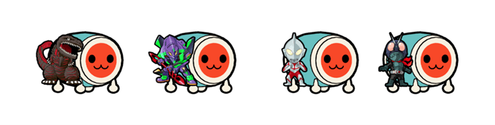 The mini characters – Godzilla, Evangelion Unit-01, Ultraman and Masked Rider – are outfit items that are usable for DON-Chan. Bring your favourite characters along and have fun playing Taiko no Tatsujin: Rhythm Festival with them!